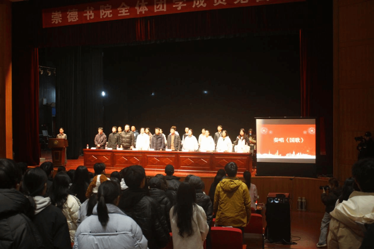 会议在庄严的《国歌》声中拉开帷幕。崇德书院常务副院长翁就勇、校团委书记丁赞华、崇德书院直属党支部书记李义唯、书院安保、后勤老师及全体辅导员,与383名团学成员相约春雨夜,共话崇德共青团工作。