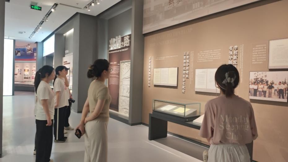 7月8日下午,在杨汛桥校区校史馆内,实践团跟随时间轴线开启一场时光之旅。一进入馆内,同学们立刻被眼前一比一还原的建校办公室所吸引,简陋的屋舍中一张张泛黄的创校起草书、一本本批复的文件,都展示着前辈们创校之路时的智慧与汗水。