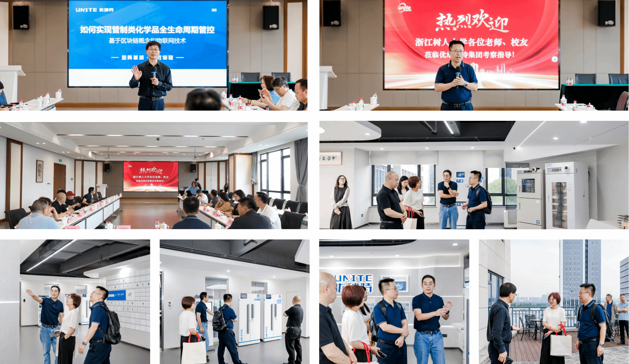 午后,阳光正好。校党委副书记王军、校友会顾问林贤根老师赶到现场,与校友们一同驱车前往优纳尔特集团——这是邱耀彰校友创办的企业,也是实验室数智化领域的“隐形冠军”。在“实验室数智化革命”主题宣讲中,邱耀彰会长介绍了公司以“矩阵式物联储存舱”为核心的实验室数智化产品体系,以及公司在推动实验室安全管理、助力教育系统改革中的创新成果,尤其是“玉琮”“玉玺”“泰坤”等理念融入企业文化的生动阐释,让人记忆深刻。韩超副院长即席发言,期待校企在环保科技领域、实验室建设等方面进一步深化产学研合作,让学术智慧与企业实践碰撞出创新火花。