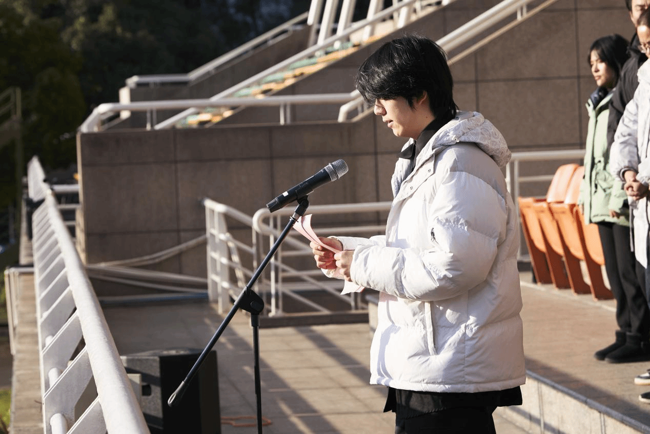 青春誓言,薪火相传。升旗礼毕,崇德书院学生干部代表集体亮相。书院老师逐一为学生干部代表们佩戴崇德书院院徽,为他们送上祝福和期许。这一幕不仅是崇德书院团学队伍重构完成的标志,也是书院与学生间形成凝聚力、化身共同体的象征。随后,学生干部代表庞布进行了题为“学雷锋,建新功,共筑书院梦”的国旗下发言。他从传承雷锋精神、践行精神力量、赓续精神血脉三个方面,阐述了雷锋精神与树人精神的内在联系,号召全体同学将雷锋精神内化于心、外化于行,积极投身书院建设,成为书院的主人翁。