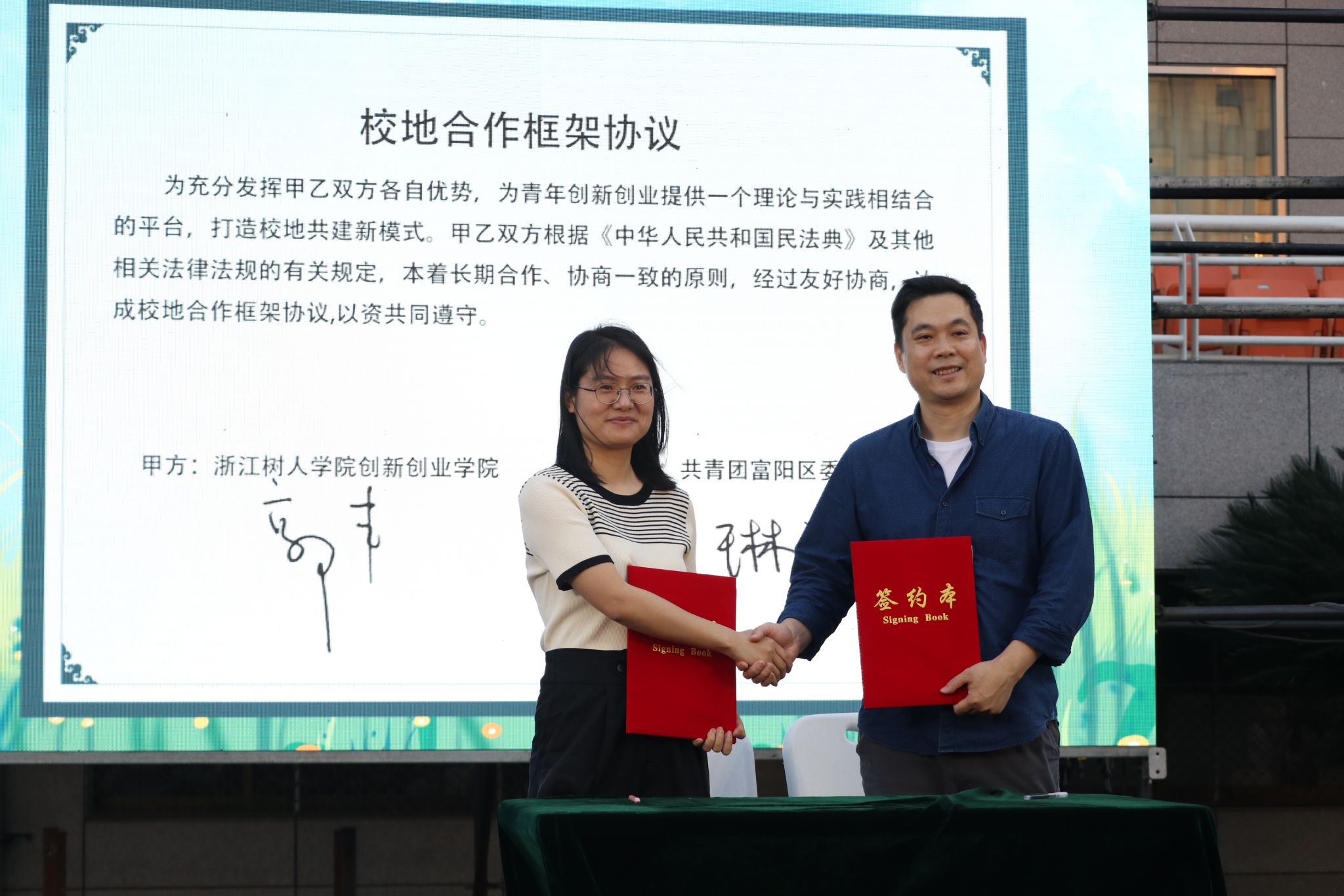 暖场环节中,活力四射的歌曲《花火》率先点燃现场氛围;校党委副书记王军致辞中指出:“今天的活动绝非简单的市集与演出,而是学校构建‘德智体美劳’全面发展育人格局的生动实践。在这里,你们既是乡村振兴的‘合伙人’,用智慧赋能乡村沃土;又是校园文化的‘创变者’,以艺术滋养精神家园。这种‘校内练摊积累经验、校外拓展验证模式’的闭环培育,这种‘音乐展演、文化传播、精神塑造’的三位一体,正是新时代青年应有的成长姿态。”随后,创新创业学院院长郭丰与共青团富阳区团委副书记董琳洁签署校地合作框架协议,标志着双创实践与乡村振兴资源的深度链接;青春市集与草地音乐节在校党委副书记王军鸣锣中同步启动,亦将四重维度的创新叙事娓娓道来。