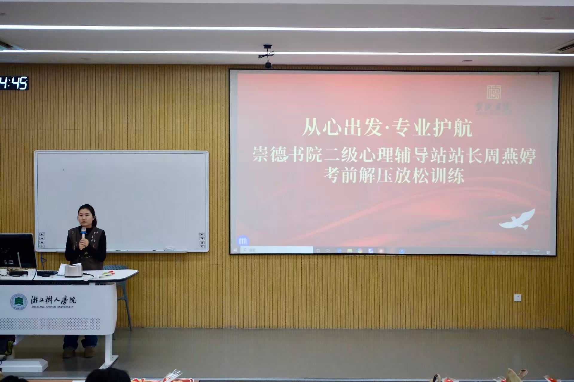 会上,崇德书院二级心理辅导站站长周燕婷老师专门为考研学子们带来了一场考前解压放松训练。在周老师的专业引导下,同学们通过简单的呼吸调节、肌肉放松和积极想象等心理技术,有效缓解了紧张与焦虑情绪,以更平和、更积极的心态迎接考试。