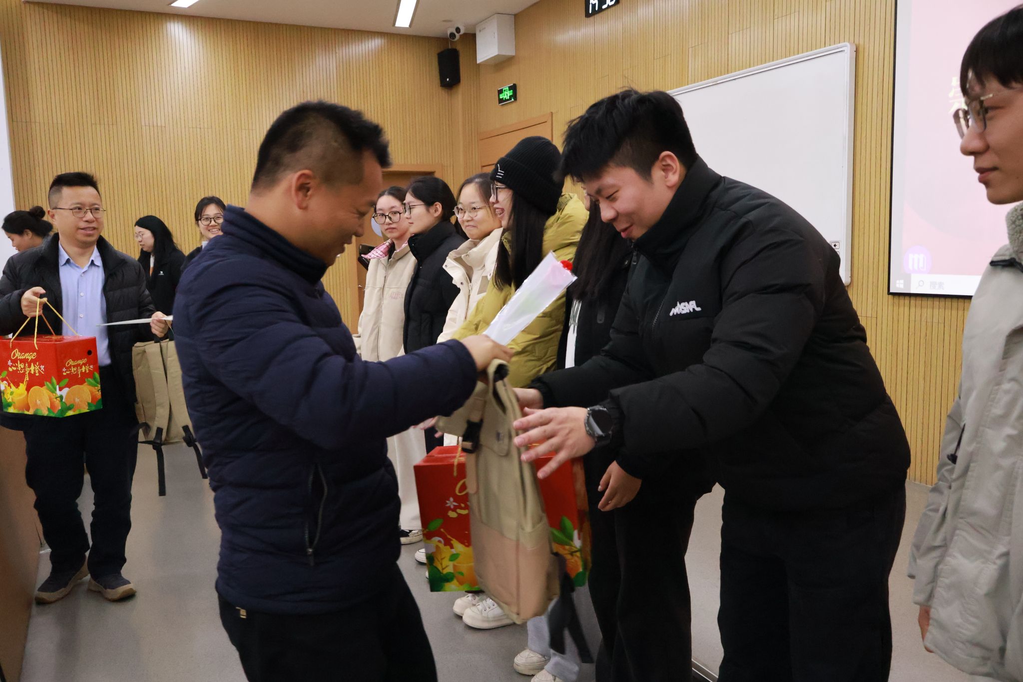 会上,全体老师为考研学生代表赠送了精心准备的“考研加油包”。每一份礼包都饱含深意:寓意“包”罗智慧、“包”你上岸的书包;象征心想事“橙”、一战“橙”硕的橙子;寄语下笔有神、金榜题名的文具;祝福定胜考场、马到“糕”中的定胜糕;以及鼓励考研开挂、梦想开花的小红花......这些充满巧思与关爱的礼物,承载着书院和学院对学子们最深切的关怀与最美好的祝愿。