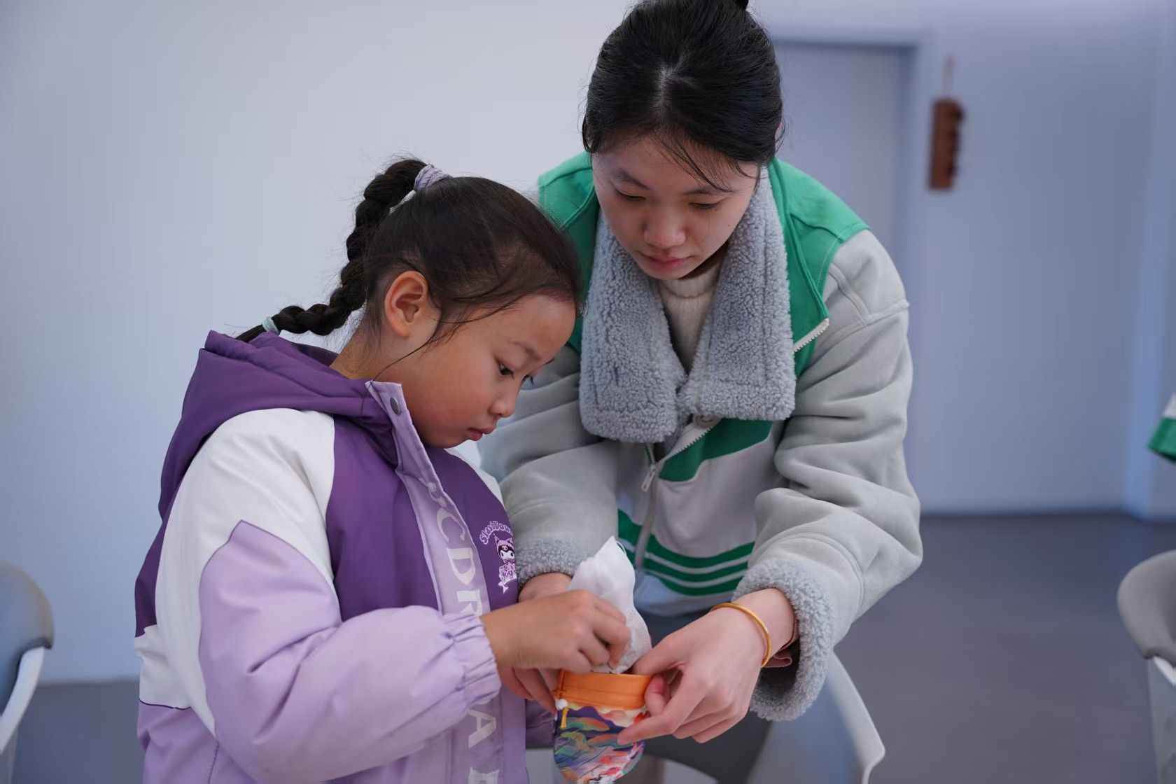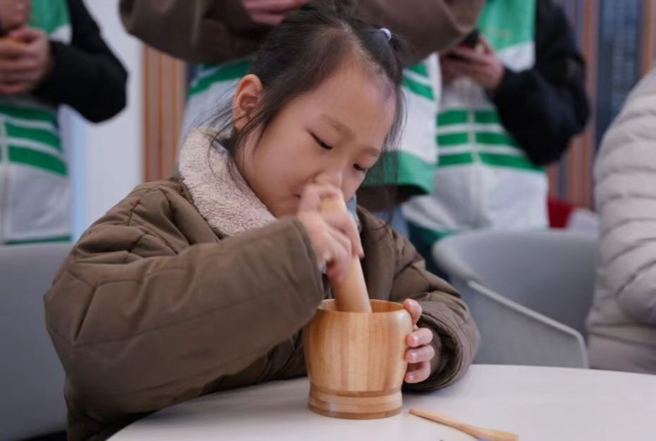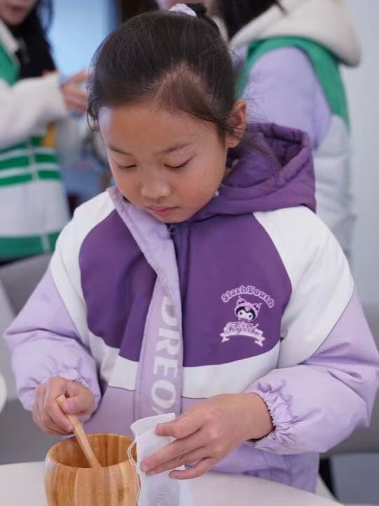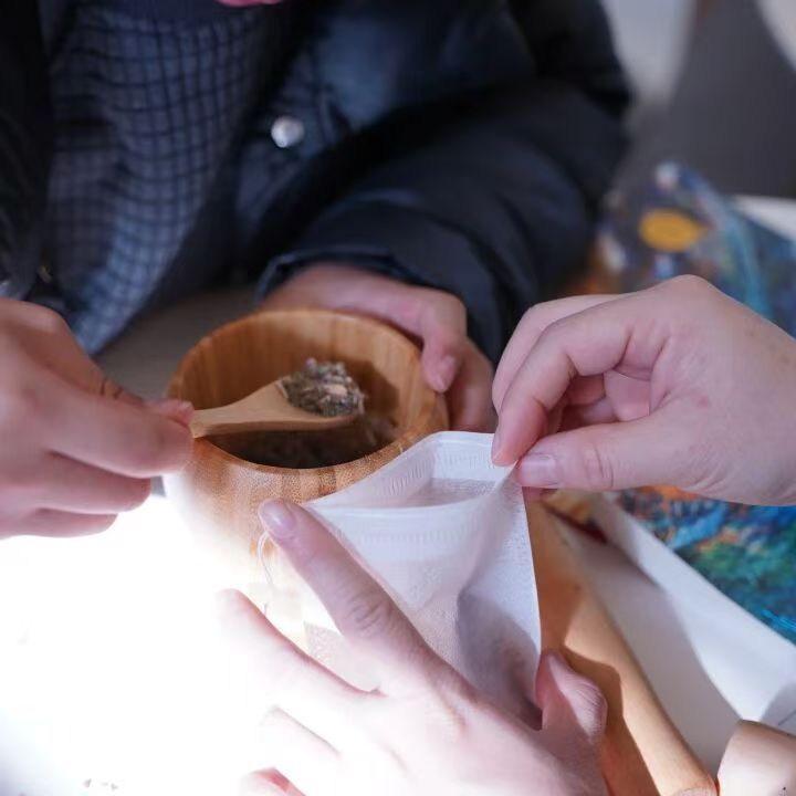 香囊制作区同样热闹非凡,非遗文化小课堂率先开讲。志愿者们生动讲述了香囊的千年传承故事,从古代驱邪避瘟的实用功效,到如今承载祈福纳祥的民俗意义,让大人孩子一同领略传统文化的厚重与魅力。随后,亲子家庭围坐桌前,开启趣味手作时光:孩子们踮着脚尖,与家长一同挑选心仪的香料组合,握着小巧的捣药杵轻轻研磨,细碎的药香伴着欢声笑语弥漫在空气中。穿绳、填料、封口,每一个步骤都凝聚着默契与心意,一枚枚绣着吉祥纹样的香囊逐渐成型。孩子们捧着亲手制作的香囊送到家长手中,奶声奶气地说着“新年快乐”,家长们则将香囊轻轻挂在孩子衣襟,这份双向奔赴的温情,成为冬日里最珍贵的记忆。