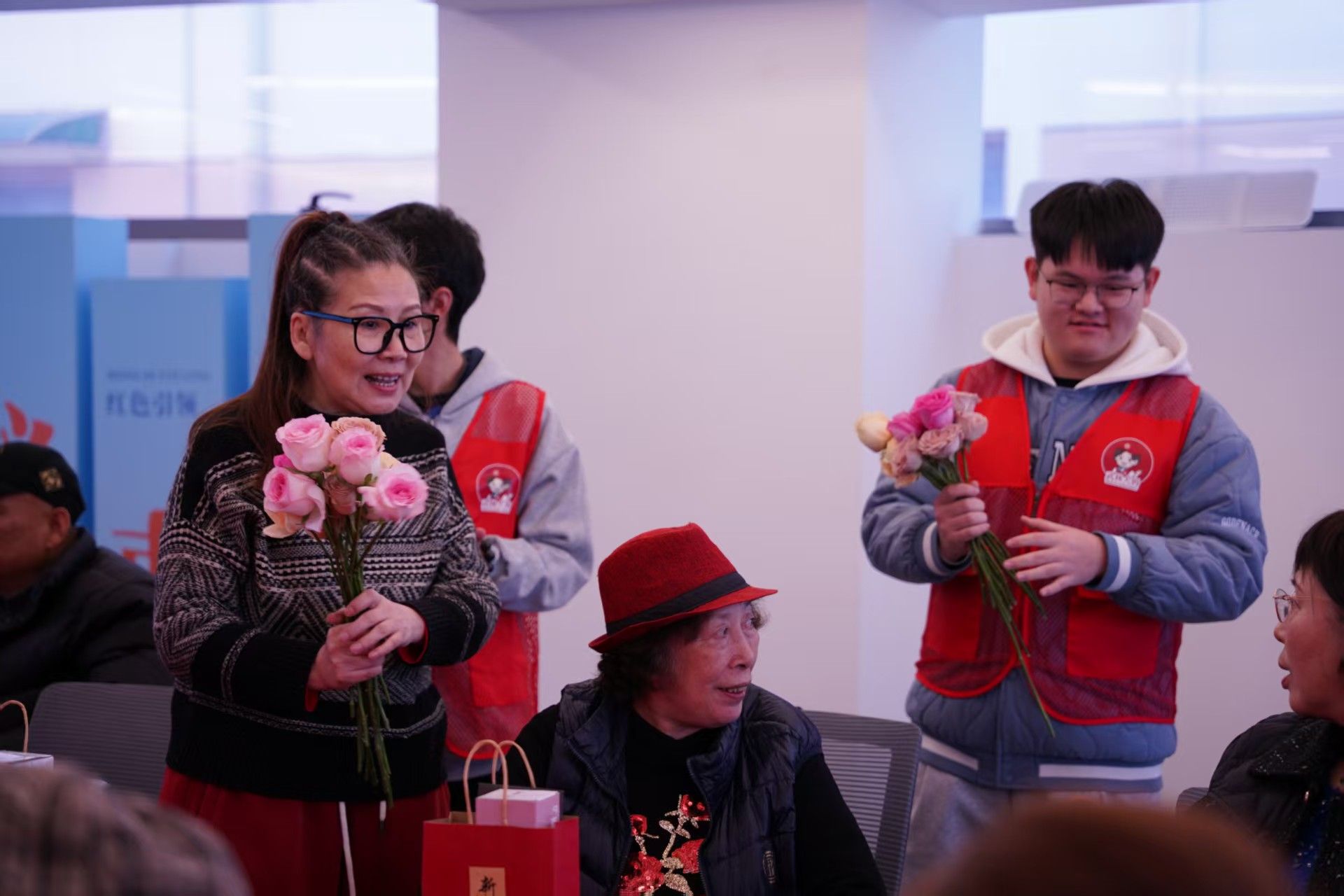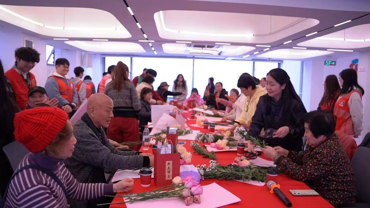 花艺体验区里,花香与笑意交织。志愿者们以“新年祈福”为主题,为大家讲解花材搭配技巧与插花美学原理,从主花的挑选到配叶的点缀,从花枝的长短错落到整体造型的和谐统一,每一个细节都倾囊相授。参与者们手持鲜花,凝神构思,在剪、插、摆之间,将对新年的期许融入花艺创作——娇艳的玫瑰象征热烈祝福,清雅的百合寓意百事顺心,翠绿的尤加利增添生机活力。原本零散的花材,在大家的巧手下变成一盆盆错落有致、意境悠远的花艺作品,既装点了生活,更传递了对未来的美好憧憬。