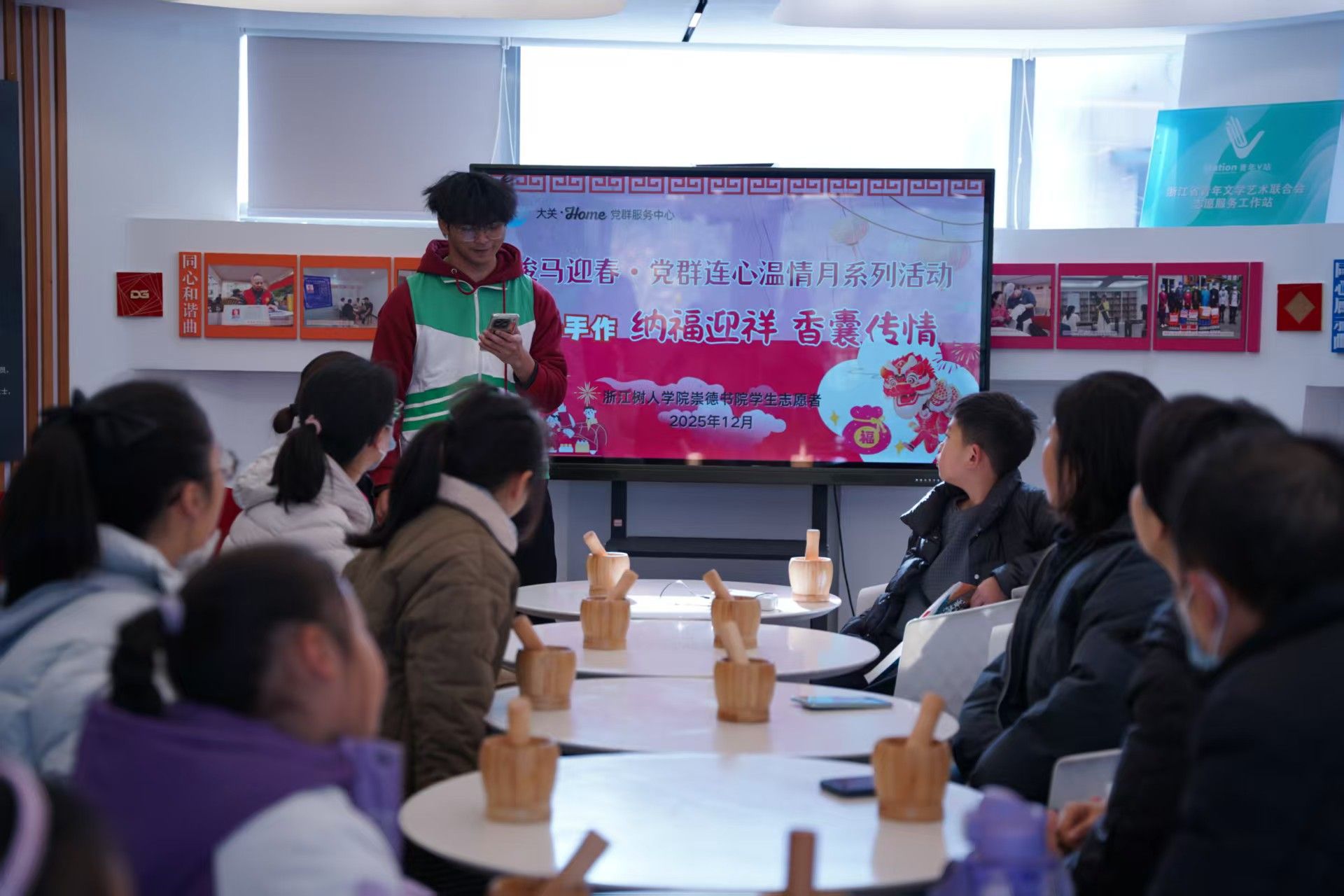 岁末将至,年味渐浓,当清雅花香邂逅非遗香囊,当校社同心碰撞温情火花,一场兼具诗意与暖意的文化盛宴在大关·Home党群服务中心悄然启幕。本次活动在2025年12月14日由浙江树人学院崇德书院志服部联合大关街道党群服务中心共同策划,以“花香漫时光 香囊纳福年”为主题,将花艺美学与非遗手作融为一体,为社区邻里送上满载心意的新年祝福,续写“校社共建、服务融合”的温暖篇章。