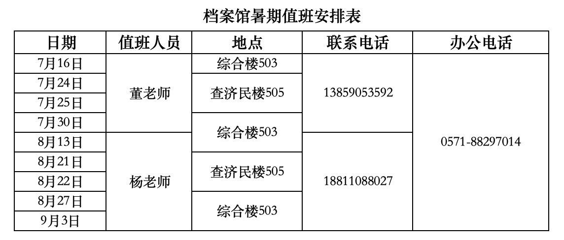 3.暑期档案馆安排工作人员到岗值班时间如下,确有需要纸质档案可在值班日内到馆查借阅。