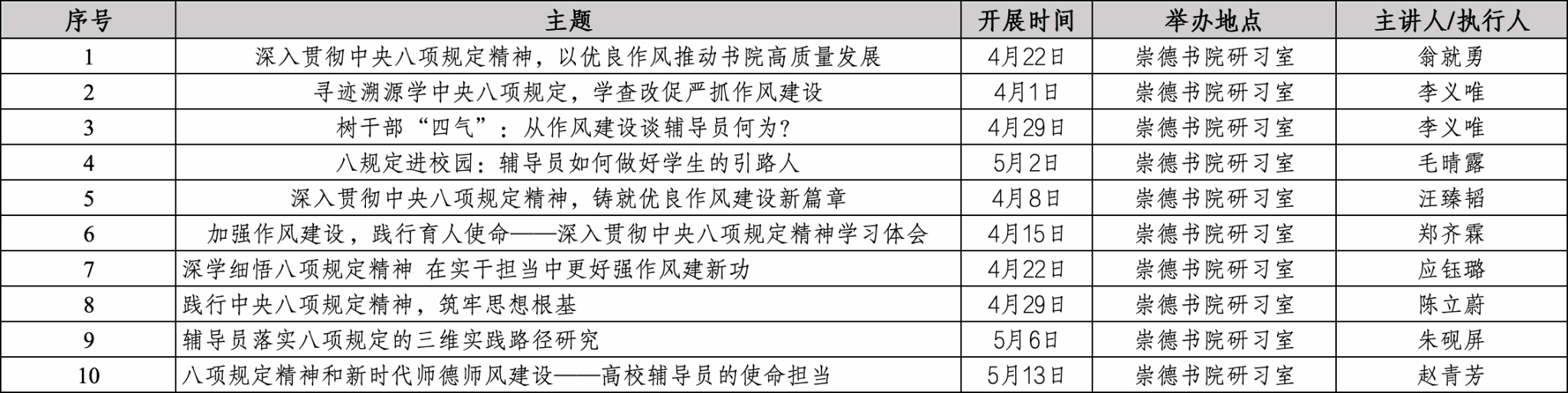 自深入贯彻中央八项规定精神学习教育以来,崇德书院加强统筹谋划、细化工作任务、精心组织实施,本学期开展了系列主题教育活动,以作风建设成效推动书院高质量发展。
