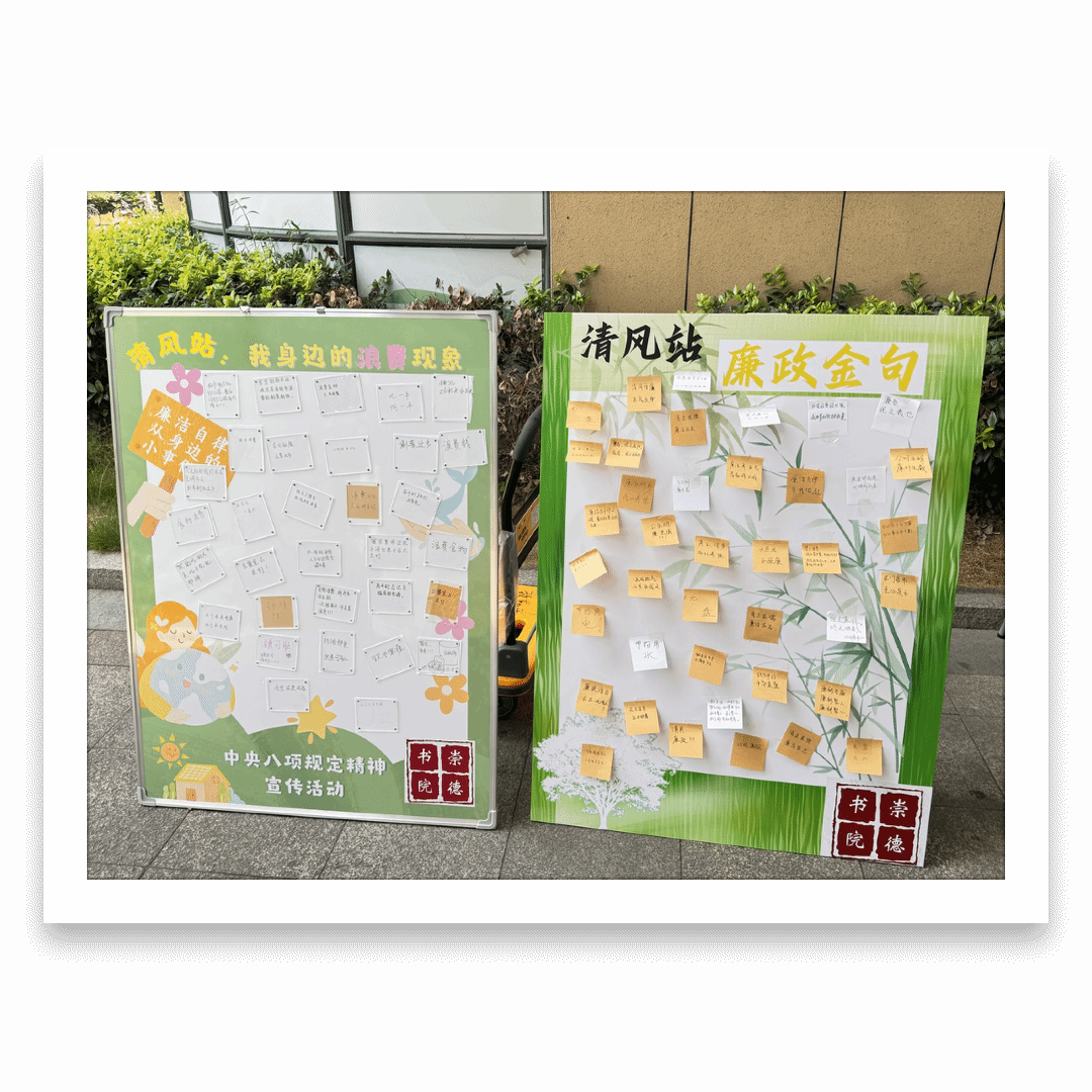 为深入贯彻落实中央八项规定精神,增强师生的廉洁自律意识,营造风清气正的校园氛围,2025年6月3日中午,崇德书院党团办组织开展“清风站:廉洁自律,从身边小事做起”活动。活动通过“心声区”和“能量区”两个板块,让师生在情境浸润中反思浪费现象、汲取廉政力量,从而在日常生活中践行勤俭节约、廉洁奉公的品德。